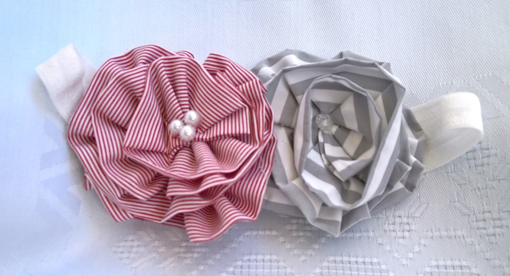 Κορδέλα μαλλιών με δύο ροζέτες με λευκό, μαλακό, γυαλιστερό λάστιχο. Η μία σε πολύ λεπτό κόκκινο-λευκό ριγέ με πέρλες στο κέντρο. Η άλλη σε φαρδύτερο λευκό-γκρι ριγέ στολισμένη με διάφανο ιριδίζον κρυσταλλάκι. Μία πολύ κομψή επιλογή για τις μικρές μας δεσποινιδούλες!
