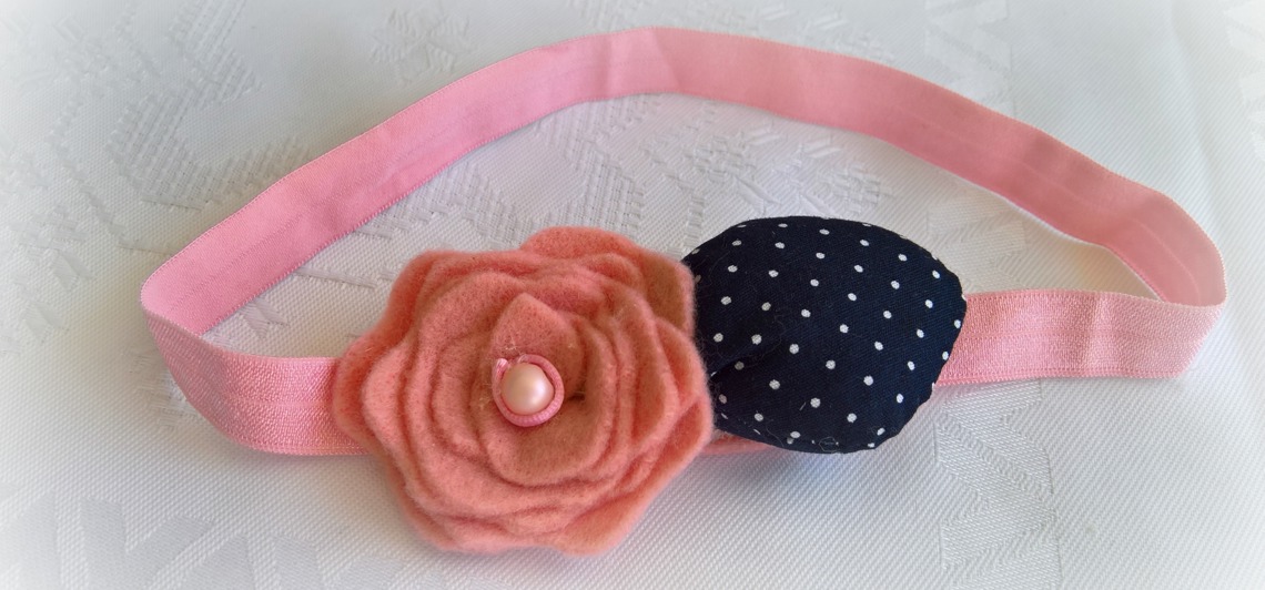 Ελαστική κορδέλα μαλλιών, με λουλούδι από φελτ σε ροζ απόχρωση και μπλε πουά γεμισμένο πέταλο.