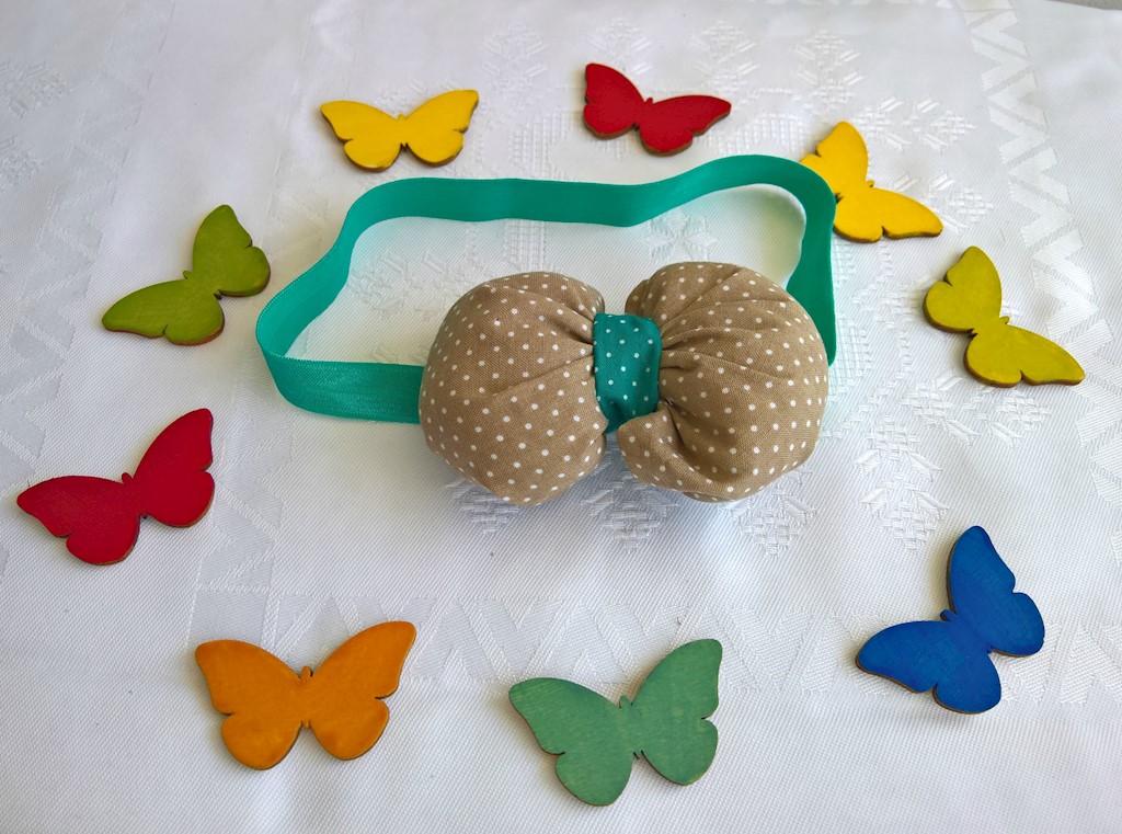 Ελαστική κορδέλα μαλλιών με μπεζ πουά γεμιστό φιόγκο και τυρκουάζ λεπτομέρειες.Πόσο όμορφο!