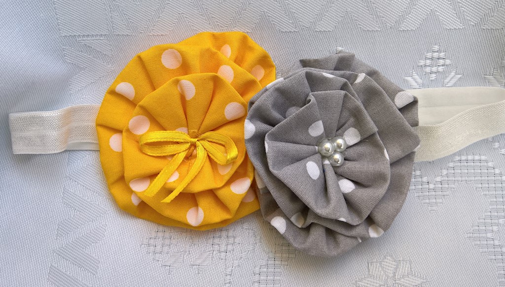 Κορδέλα μαλλιών με πουά ροζέτες με λευκό, μαλακό γυαλιστερό λάστιχο. Η μία σε φωτεινό κίτρινο χρώμα με λευκό πουά και κίτρινο φιογκάκι. Η άλλη σε γκρι με λευκό πουά και πέρλες. Μία πολύ ιδιαίτερη επιλογή για μοναδικές εμφανίσεις!
