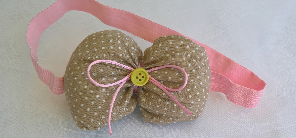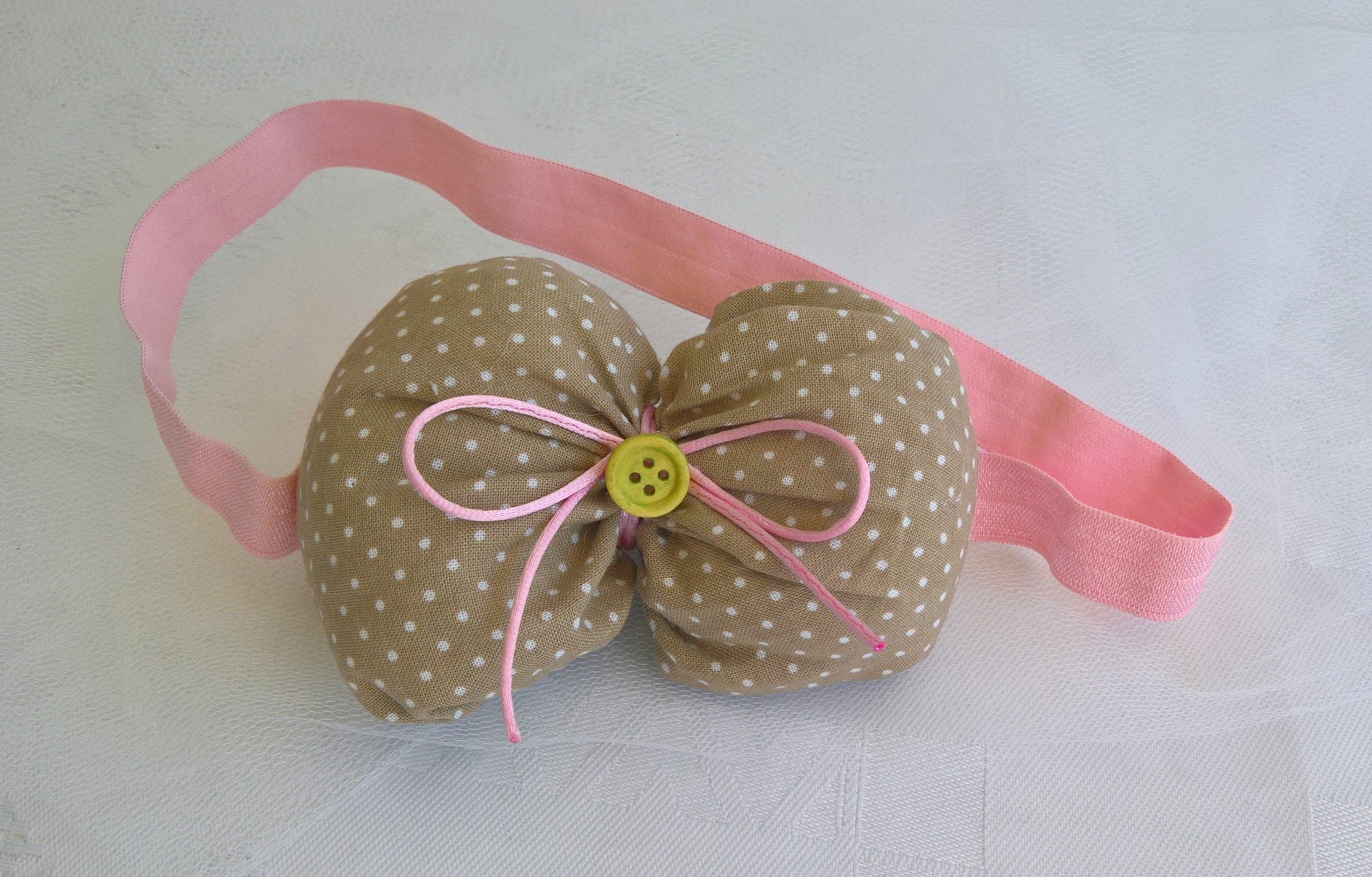 Κορδέλα μαλλιών με μπεζ πουά γεμισμένο φιόγκο και ροζ λάστιχο.