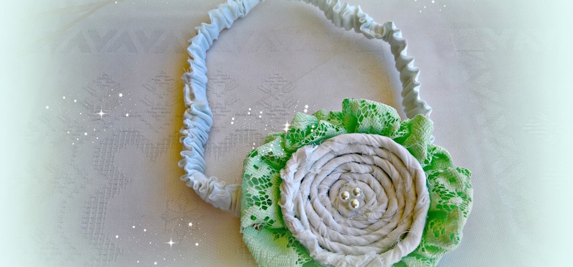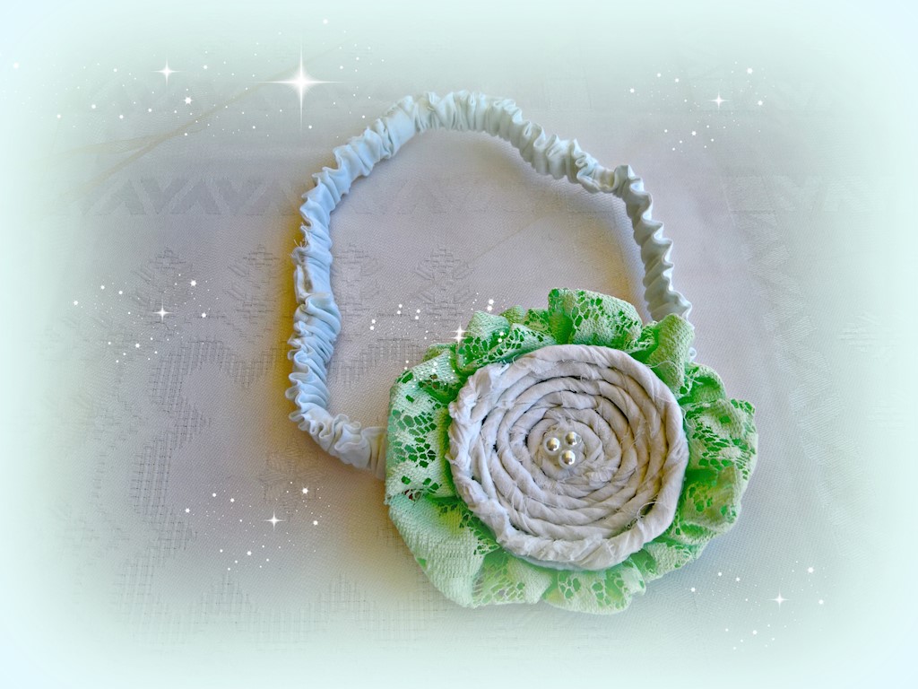Κορδέλα μαλλιών με ροζέτα φτιαγμένη από παστέλ φιστικί δαντέλα και λευκό βαμβακερό ύφασμα. Υπέροχη και ρομαντική!
