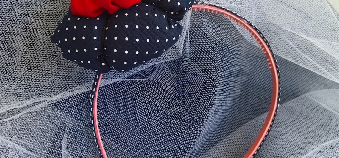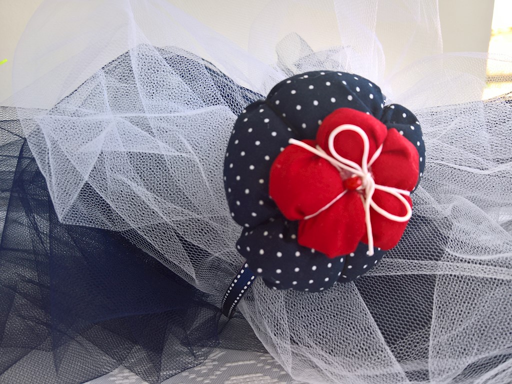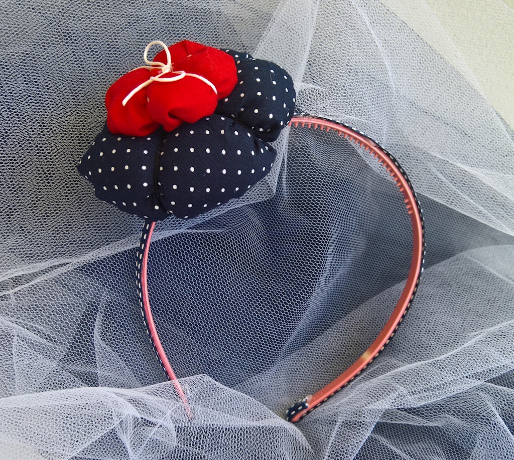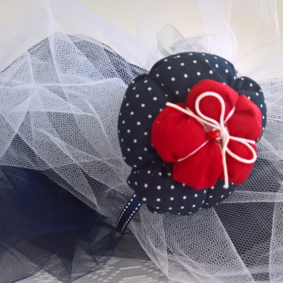 Στέκα μαλλιών σε μπλε σκούρο πουά χρώμα με γεμισμένο λουλούδι και κόκκινες λεπτομέρειες. Για μια όμορφη δεσποινίς!